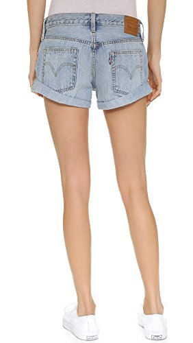 Denim Levi's Vintage Clothing shorts with heavy fading and shredded holes. Cuffed hem. 5-pocket styling. Button fly.