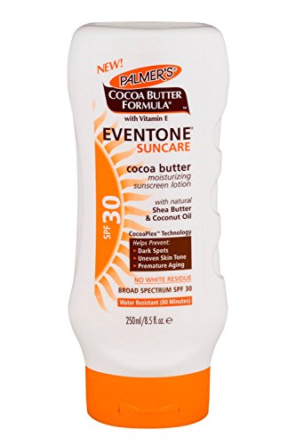 Palmer's Cocoa Butter Formula Eventone Suncare contains Cocoa Butter, Shea Butter and Coconut Oil, active ingredients and natural moisturizers, to protect your skin from the damaging effects of the sun and help you maintain a youthful even skin tone. CocoaPlex Technology helps to prevent dark spots, uneven skin tone and premature aging. It provides 80 minute of water/sweat resistance and UVA/UVB Broad Spectrum protection to leave a sheer radiance on skin without any white, pasty residue.Feature