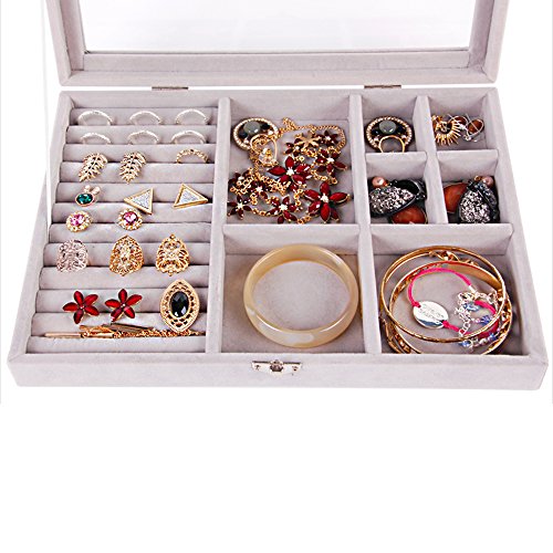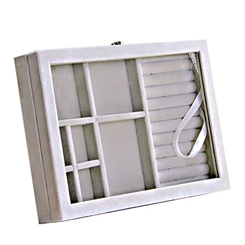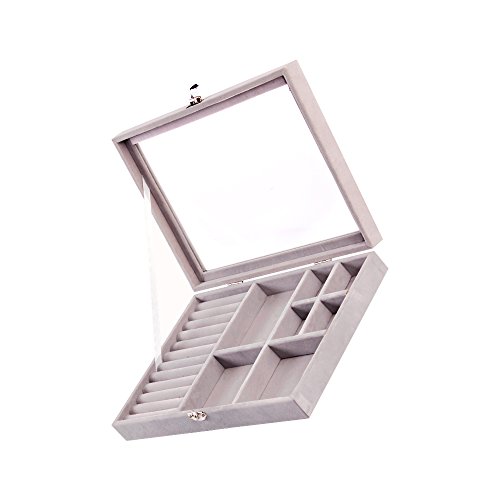 -. Binding : Kitchen -. Brand : Aco&bebe House -. Feature : Made of quality MDF and soft gray velvet, this jewelry box is super excellent to protect your beloved jewelry from scratching and damaging / Multi-functional jewelry organizer with necklace hooks, ring tray and compartments for cufflinks, earrings, brooches and other jewelry / Large glass top makes it easy to choose jewelry when dressing yourself / Size:11.2 x 7.8 x 2 inches -. IsAutographed : 0 -. ProductGroup : Home -. ProductTypeName : HOME -. Title : Aco&bebe House Jewelry Box and Organizer Display Tary Storage Case with Large Glass Top