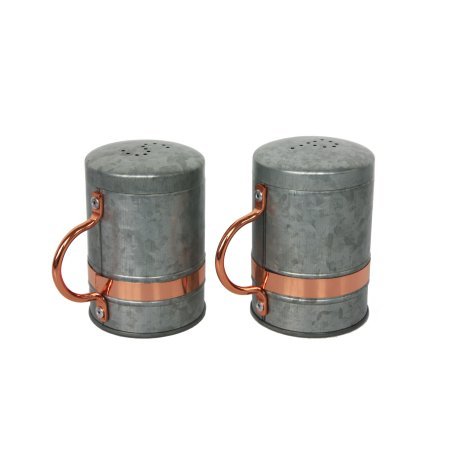 Product Description Galvanized look,great way to? bring a country feel to any home. BHG Galvanized Salt Pepper Shaker Set Item Size: 4.09 IN W x 2.83 IN D x 4.17 IN H (10.4 CM x 7.2 CM x 10.6 CM) Color: Galvanized and Copper. Care Instructions : Not microwave or dishwasher safe. Hand wash only with non-abrasive material. 0