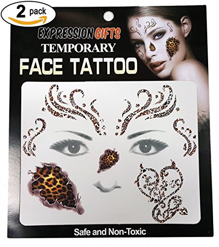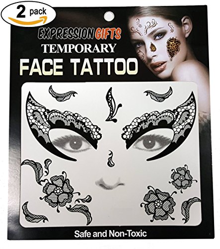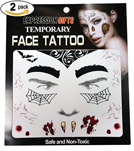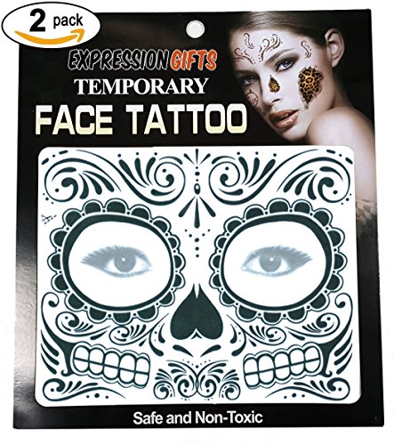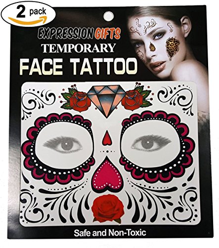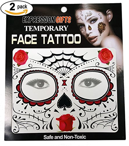 -. Binding : Apparel -. Brand : Expression Gifts -. Department : mens -. Feature : The perfect accessories for your Halloween costume, masquerade ball, or any party where you want to get dressed up / Looking for Day of The Dead face tattoos? Look no further. We have a huge collection / Our assortment of tattoos kits for your face are guaranteed to have a design you love / Each kit comes complete with 2 face tattoos - share with a friend or use them both yourself / Safe and non-toxic, easy to apply and easy to remove. Fright Night face tattoos will last all night long! -. Model : Temp_Face_Tattoo -. NumberOfItems : 2 -. PackageQuantity : 2 -. ProductGroup : Apparel -. ProductTypeName : SHIRT -. Title : Expression Gifts 2-Pack Temporary Face Tattoo Kits - Assorted Styles For Halloween and Masquerade Parties