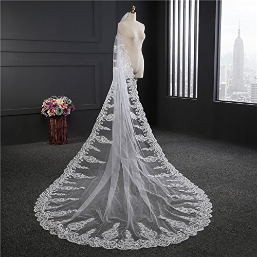 Material:Lace and Crystal Sequins Size:Length: 138 inches(350 cm) Width: 71 inches(180 cm) Color:White or Ivory Occassion:This veil is perfect for wedding dress.