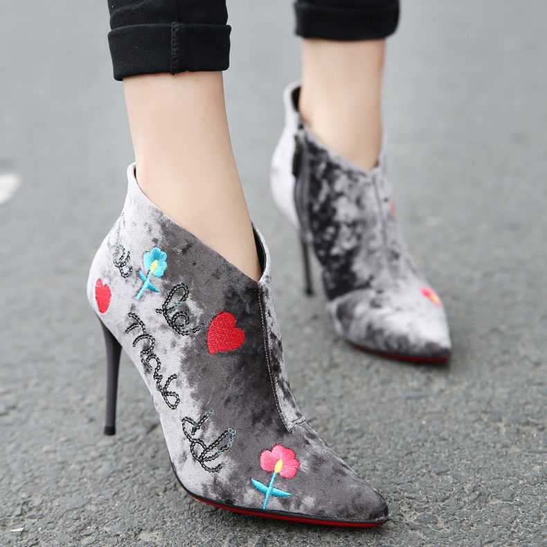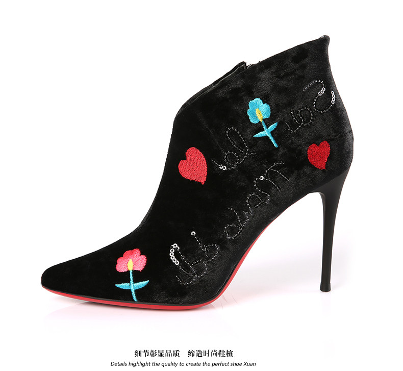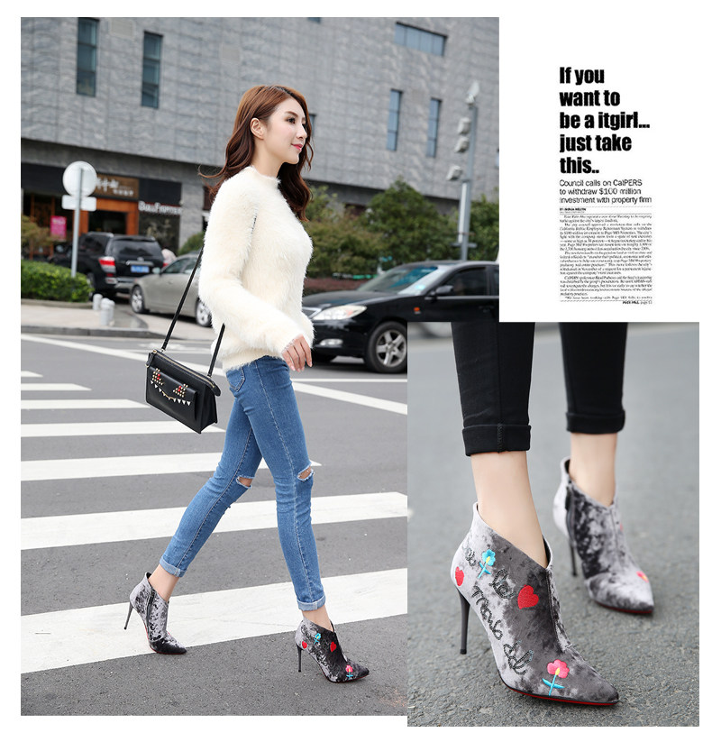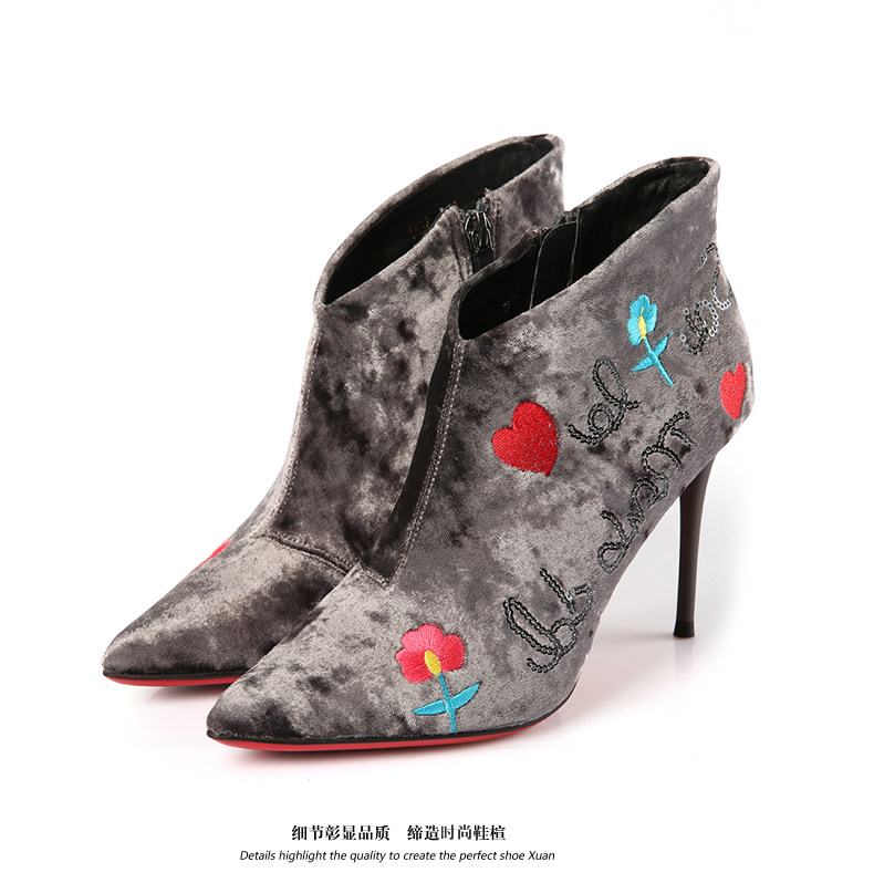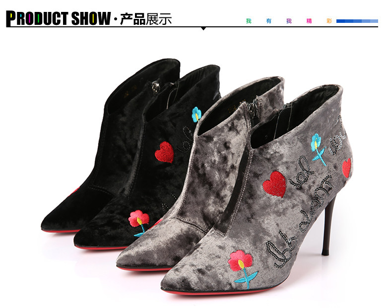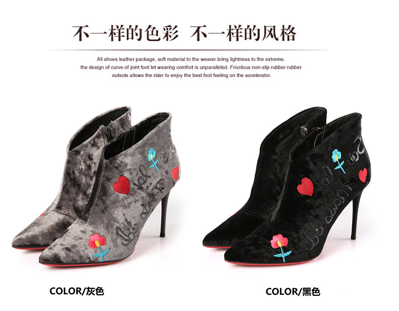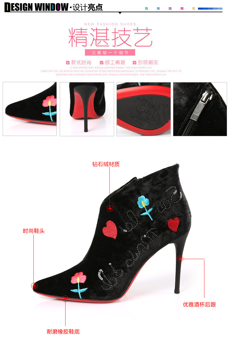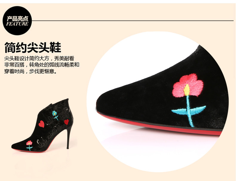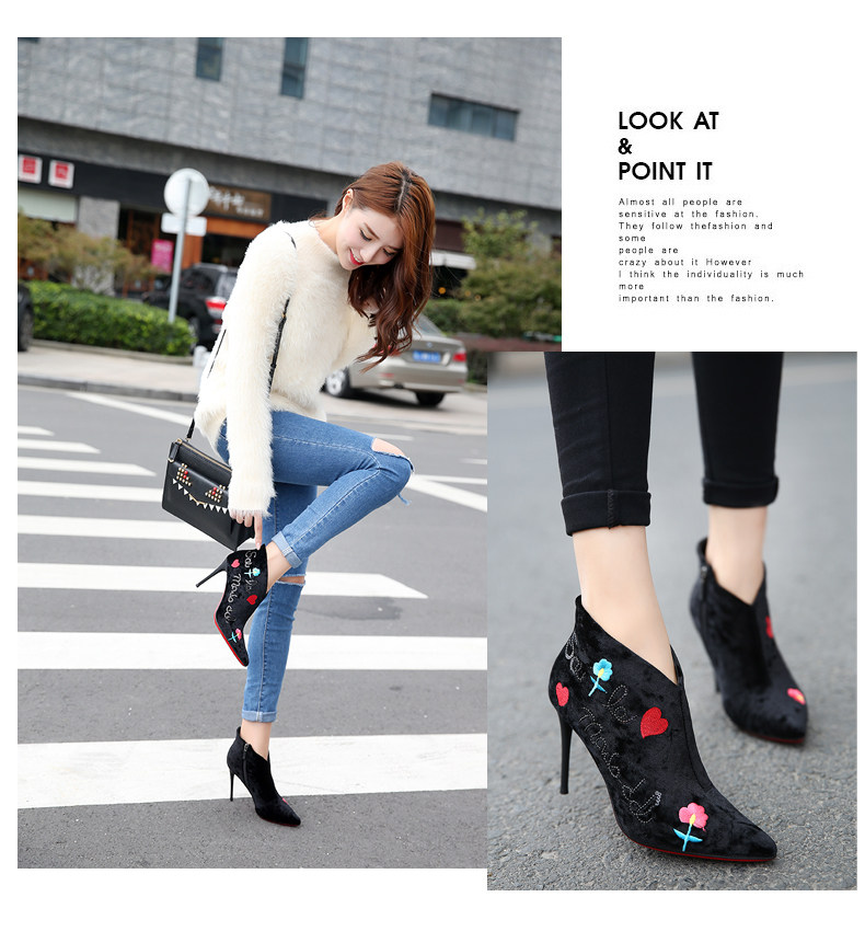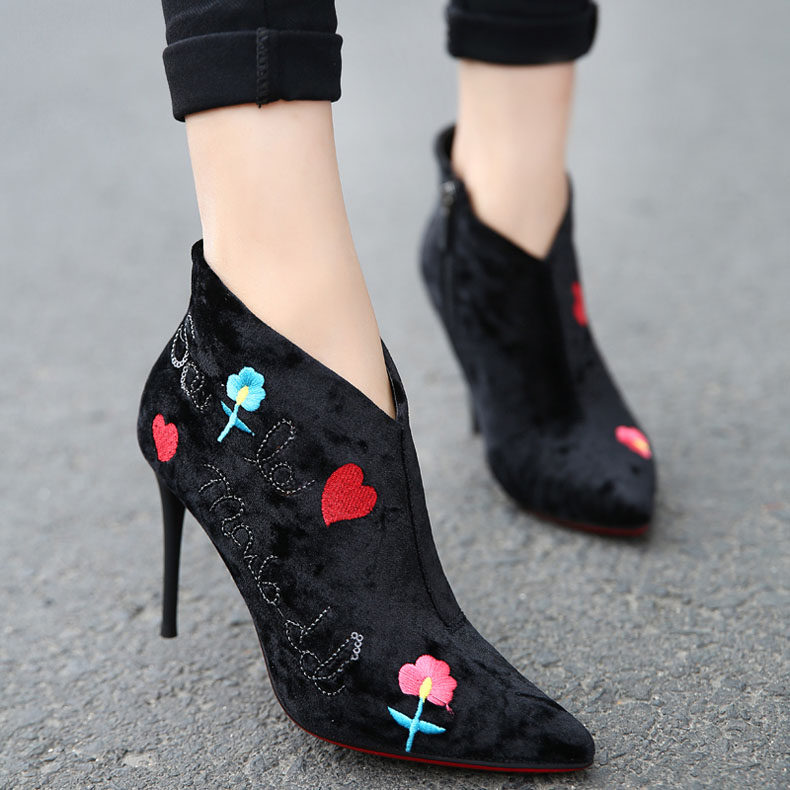 欧美名媛短靴秋冬靴子细跟高跟鞋尖头时尚绣花马丁靴女靴及裸靴