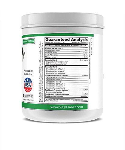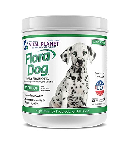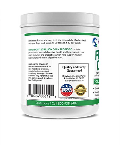-. Binding : Misc. -. Brand : Vital Planet -. EAN : 0850964006125 -. Feature : Contains 20 Billion live probiotic cultures in each capsule to help maintain your dog's immunity. When comparing probiotic options for your companion be sure to look closely at the number of live cultures in each serving. / 10 Probiotic Strains are included in this comprehensive formula for maximum strain diversity, including dog specific strains Guaranteed Delivery - Delayed release capsules ensure that the capsule makes it through the stomach's acidic environment and are delivered to the small intestine / Your dog has many unique probiotic strains in their digestive tract. FLORA DOGTM 20 BILLION combines 10 specific probiotic strains to more closely match your dog's digestive system and to provide maximum diversity. / Powered by Prebiotics :Prebiotics boost natural gut bacteria and help support healthy bacterial growth in the digestive tract. / Our convenient powder is easy to sP.R.Inkle on your dog's food. With a simple scoop, you can provide your dog with over 20 billion live probiotic cultures from 10 unique strains. -. Label : Vital Planet -. Manufacturer : Vital Planet -. Model : 16000 -. MPN : 1600 -. PackageQuantity : 1 -. PartNumber : 1600 -. ProductGroup : Pet Products -. ProductTypeName : PET_SUPPLIES -. Publisher : Vital Planet -. Studio : Vital Planet -. Title : Vital Planet - Flora Dog - High Potency, Multi-Strain Probiotic Formula for Dogs - 3.92 oz 30 Servings -. UPC : 850964006125