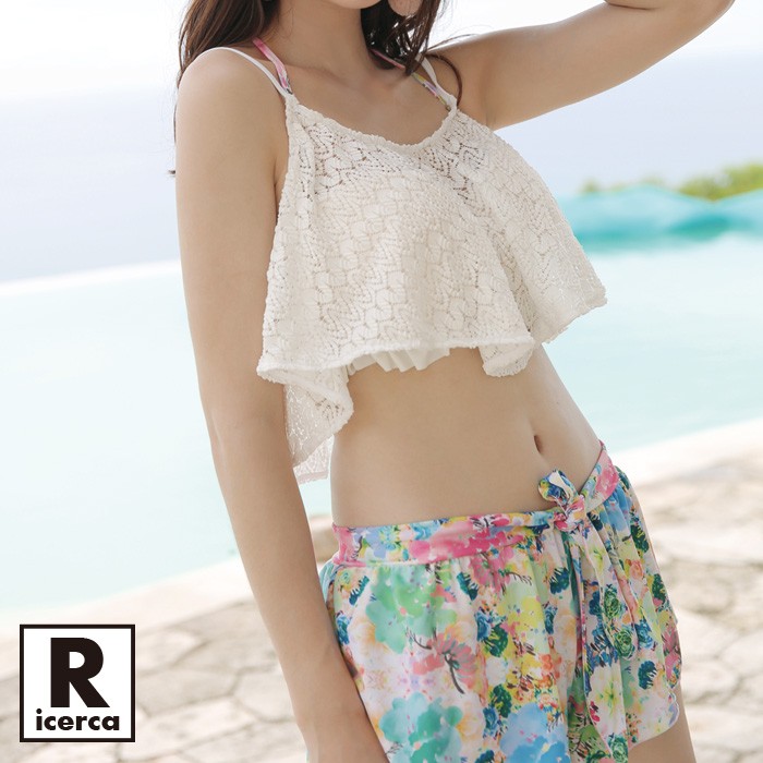 レーストップとオルテガ柄パンツの可愛いタンキニ4点セットです。