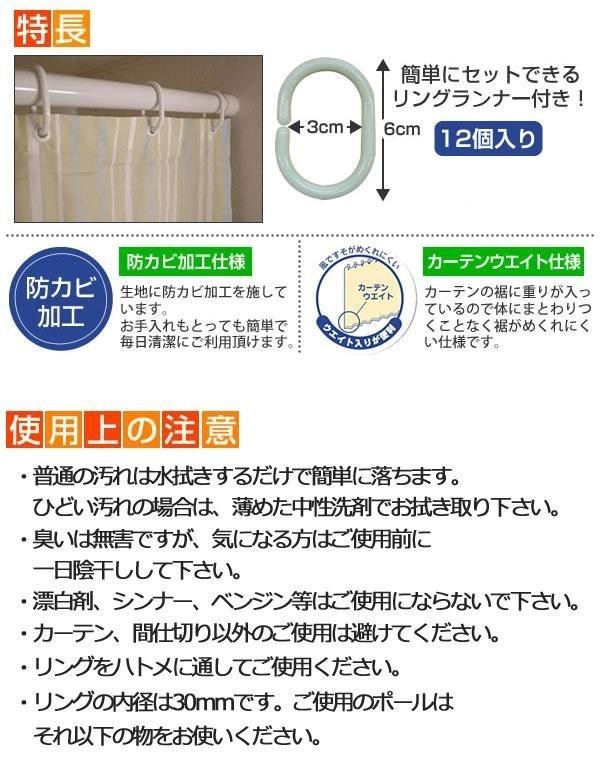 | 浴室、洗面所等の水はねよけ、間仕切りに♪防カビ加工を施しています。本体と同じ色をした、専用のリングランナーが付属しております。カーテンウエイト入りなので、カーテンがヒラヒラなりにくい!! |