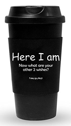Funny Guy Mugs Here I Am Now What Are Your Other 2 Wishes Travel Tumbler With Removable Insulated Silicone Sleeve, Black, 16-Ounce