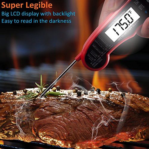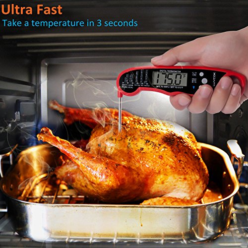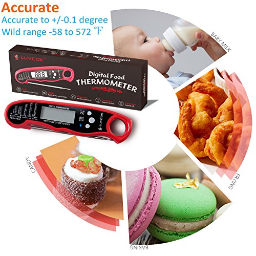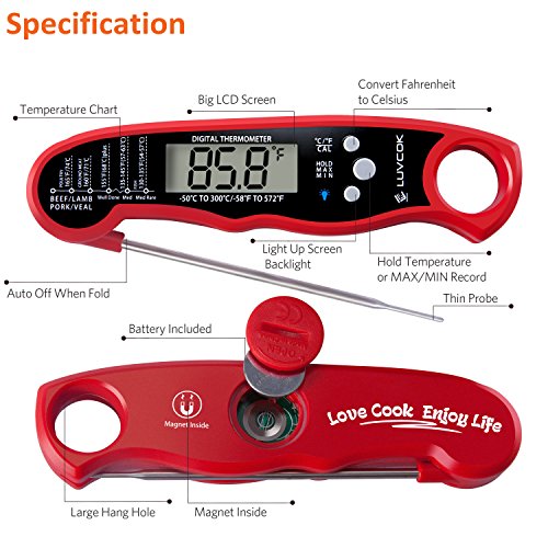 Studio : LUVCOK Publisher : LUVCOK Binding : Kitchen Product Description The frustration of overcook or undercook ends. Luvcok food thermometer will assist you to cook like a pro! KEY FEATURES: - ℉/℃ Switchable: can switch between Fahrenheit and Celsius easily - Long Probe: 4.4' probe with extension to a total length of 10.6', keeps your hands away from the heat when cooking - Auto Off: auto off when probe fold or 10 minutes without operation, to save power - Temperature Chart: temperature chart on the front panel, convenient to take as reference - Widely Use: accurate to /-0.1 degree with a wide range of -58℉-572℉, works on all types of food - Waterproof: IP67 rated waterproof, easy clean under running water - Ultra Fast: 2-3 seconds to read temperature - Legible: big LCD display with backlight, easy to read in the darkness - Easy Storage: big hang hole and inside magnet, can put almost anywhere MATERIAL: : Probe: food grade 304 stainless steel Body: ABS HOW TO USE 1) Before use, please tear off the protecting film from the front panel 2) Unfold the probe from housing then the LCD will display ambient temperature immediately 3) Insert the probe into food , 3 seconds later, the LCD will display temperature of the food 4) Before withdrawing from food, if you press HOLD button, the temperature reading will be held and do not change until you press HOLD again 5) To read in the dark, press light button and it will light up the display 6) Fold the probe into housing then the it will be off, also it will auto off if no operation in 10 minutes Luvcok mission is to assist you to 'Love Cook and Enjoy Life', please 'Add to Cart' and cook like a pro from now on! 0