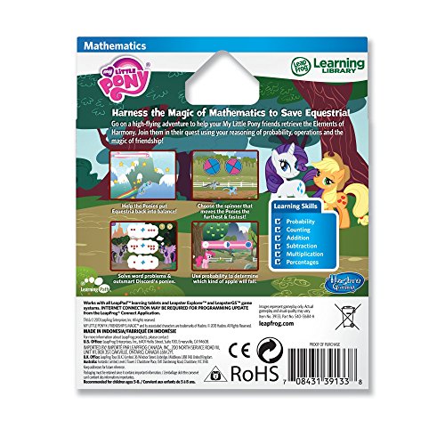 -. Feature : Help your My Little Pony friends retrieve the Elements of Harmony and bring Equestria back into balance! / Have high-flying adventures with four fun mini-games to reinforce the learning / Teaches probability, counting, operations (addition, subtraction, multiplication and division) and percentages / Ages 5-8 years / Works with all LeapPad learning tablets, LeapsterGS and Leapster Explorer (sold separately); Internet connection may be required for cartridge