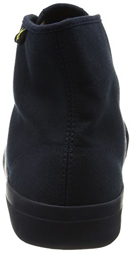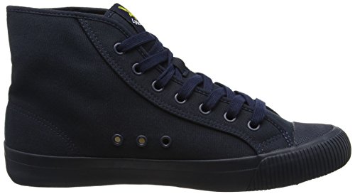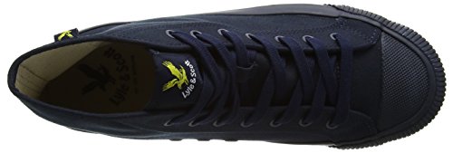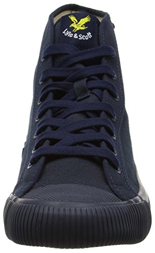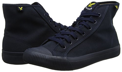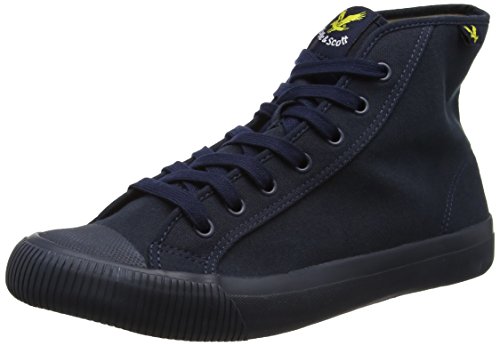 A pair of high-top trainers by Lyle Scott, constructed from a durable canvas upper and a vulcanised rubber sole. The trainers feature a textured rubber toe cap, seven eyelets with flat woven laces, tonal stitching throughout, and signature Lyle Scott branded tags to the tongue and ankle. - High-top trainers