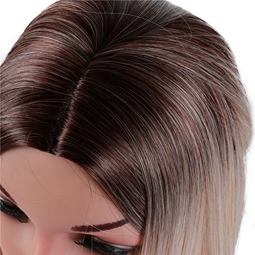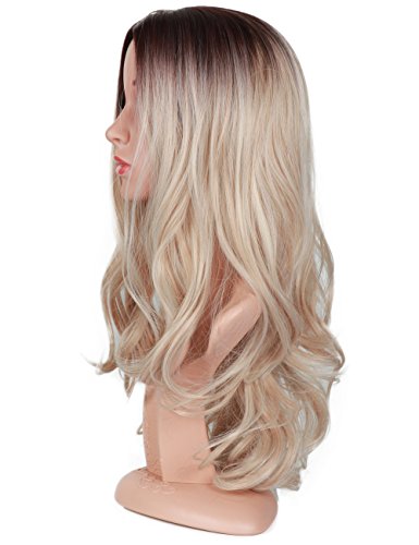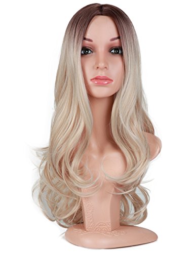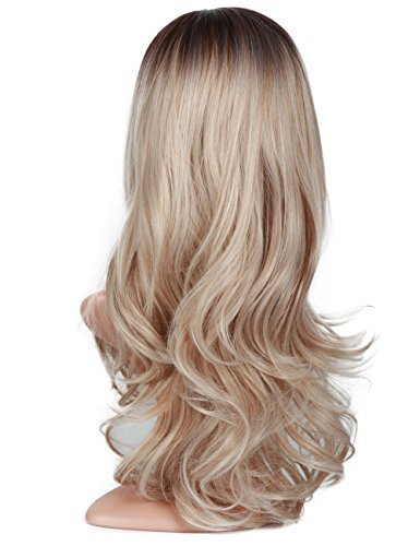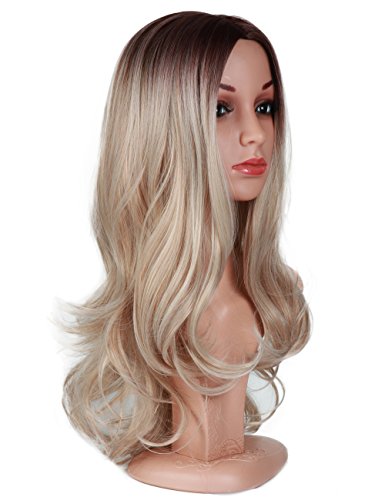 Fani Wigs Long Wavy Ash Blond Ombre Wigs for Women Dark Brown Roots Body Wave Middle Part Heat Resistant Synthetic Full Wig Cosplay Wigs with Free...