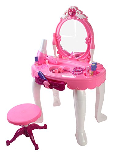 Product DescriptionGlamour Battery Operated Toy Vanity Mirror Dresser Playset w/ Lights, Sounds, Chair Stool, Toy Jewelry Accessories0