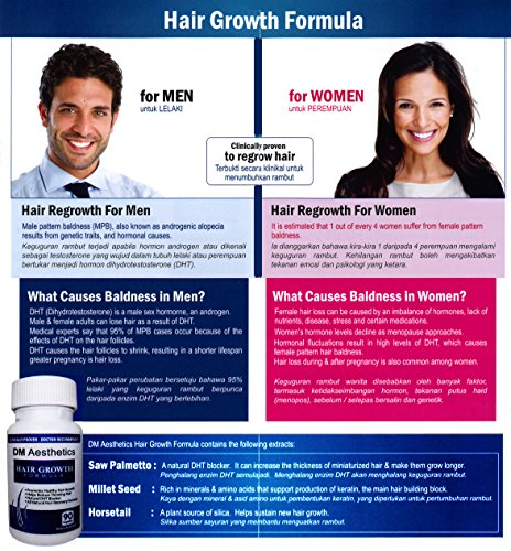 -. Binding : Health and Beauty -. Brand : DM Aesthetics -. EAN : 0748855495397 -. Feature : Minimizes hair loss / Stimulates hair growth / Works for men and women / No Side Effects / Contains Saw Palmetto that increases the thickness and length of hair -. IsAdultProduct : 0 -. Label : DM Aesthetics -. LegalDisclaimer : Must be Over 18 to consume. Kindly get advise with your physician regarding the ingredients before consuming this product -. Manufacturer : DM Aesthetics -. MPN : DMAHG -. PackageQuantity : 1 -. PartNumber : DMAHG -. ProductGroup : Health and Beauty -. ProductTypeName : HEALTH_PERSONAL_CARE -. Publisher : DM Aesthetics -. Studio : DM Aesthetics -. Title : Hair Growth DM Aesthetics - Millet Plus 90 Capsules -. UPC : 748855495397