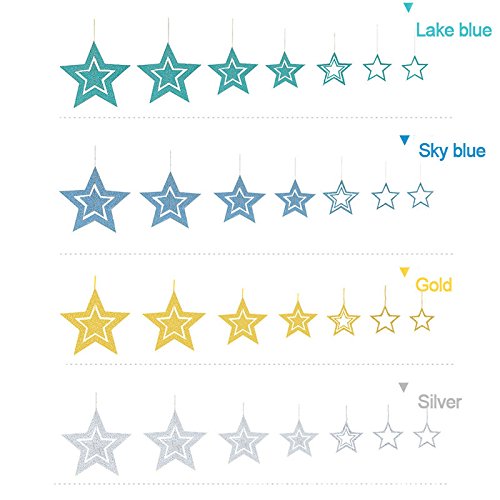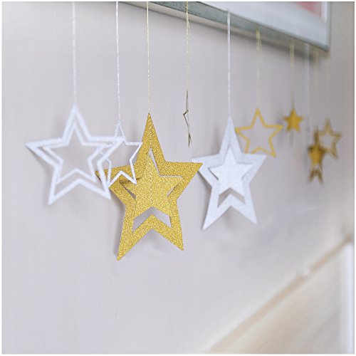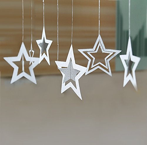 Package includes: 2 pcs Silver Star Paper Garlands of the color as the photo shows.Each string is about 6.6 feet long. Choose the style you prefer to best show the theme and atmosphere of your party. Like romantic purple, noble gold,sweet pink,or cool blue
