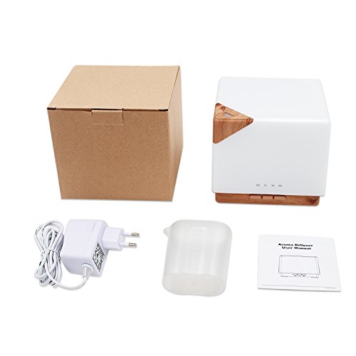 MODERN DESIGN - Classic cube with natural wood design.Fasion Oil Diffuser Humidifier with timer setting for 1H/ 3H/ 6H running time and 7 LED color changing between bright and dim.