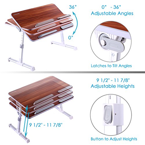 -. Feature : ONE BUTTON OPERATION - Fully assembled, two auto-lock buttons on each legs easily to raise or drop for 5 height positions (adjustable from 9 1/2" - 11 7/8"); Two latches on each side enable tilt to 4 angles (0° 12° 24° 36° ). You can bring your laptop to any perfect heights or angles while lay back on your bed or couch / HEALTHIER WORKING - Use this adjustable table on a regular height desk and stand up to work instead of sitting at the keyboard for hours, it will help with alleviate neck and back pain / 2 ANTI-SLIP STOPPERS - A stopper protects your laptop from skidding while tilting the top, an extra soft wrist rest provides a good comfort on your wrist while working / MULTIFUNCTIONAL LAPTOP TABLE - Use the table as a laptop desk for bed/couch for a relaxing workspace, as a standing desk at office if you get tired of sitting, as a bed reading table for a spacious space, or tablet stand, or as a breakfast serving tray in bed for lazy mornings / WARRANTY - We're proud to stand behind this laptop desk. If you're not completely satisfied, we'll offer you a 30-Days Money Back Guarantee and free exchange within 24 months after you receive the product