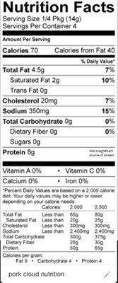 -. Binding : Misc. -. Brand : Bacon Heir -. EAN : 0737079290499 -. Feature : Comes with THREE 2 oz. (large bag) of Pork Clouds Malabar Pepper / 100% GMO Free Olive Oil is used in kettle cooking process. / Pork Clouds are Hand Cooked. / Hand Stirred, and Hand Seasoned. / Pork Clouds are an exercise in minimalism emphasized on the power of high-end individual ingredients rather than over complicate things with a panoply of preservatives. -. IsAdultProduct : 0 -. Label : Bacon Heir -. Manufacturer : Bacon Heir -. PackageQuantity : 2 -. ProductGroup : Grocery -. ProductTypeName : GROCERY -. Publisher : Bacon Heir -. Studio : Bacon Heir -. Title : Value 3 Pack: Pork Clouds Malbar Black Pepper (Large 2 oz. Bags) -. UPC : 737079290499