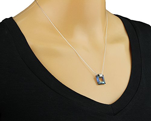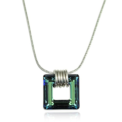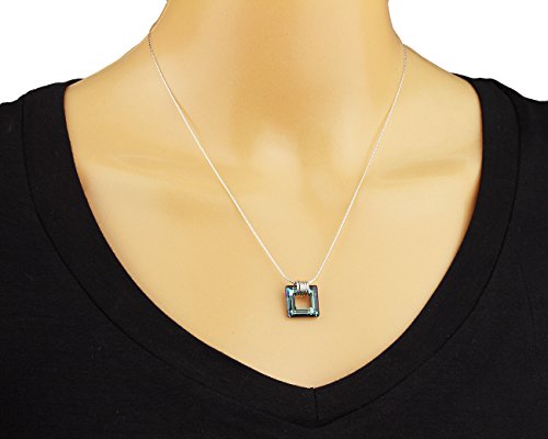 Bermuda Blue square crystal pendant made with Original Swarovski crystal and comes with 925 Sterling Silver chain. The pendant is linked to the chain with five small 925 Silver hoops. The pendant sparkles with a gorgeous teal color. The pendant measures about 5/8 inch in length.