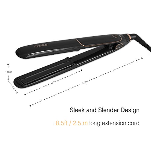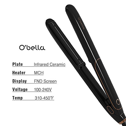 • Styling Without Burning O'bella hair straightener iron applies Infrared Technology and Ceramic Tourmaline Plates help you style hair quickly without baking or damaging it. • Easy Control Than Ever Before The ionic flat iron with extra-long floating plates make styling fast and easy in just a few minutes. Better control with single button for temperature ( 310 - 450 ? ) and auto shut off in 1 hour inactivity. • Perfect For All Hair Types The O'bella Infrared Hair Straightener is designed with thick and coarse even natural hair.