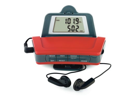 -. Feature : Features an auto scan FM radio tuner with six-station memory / Accurately measures distance, steps, and calories burned / Large, readable dual-line display / Includes a real-time clock and timer / SP.R.Ing-loaded, stay-put belt clip