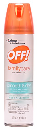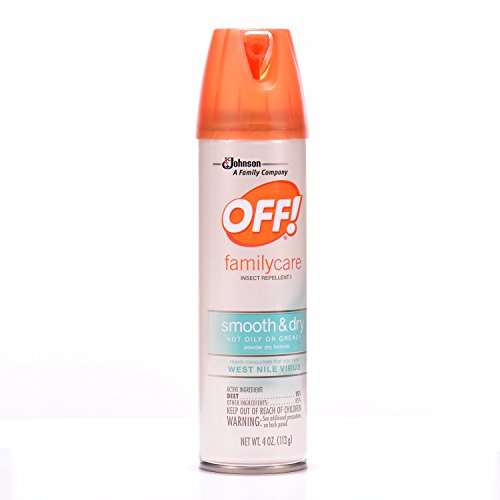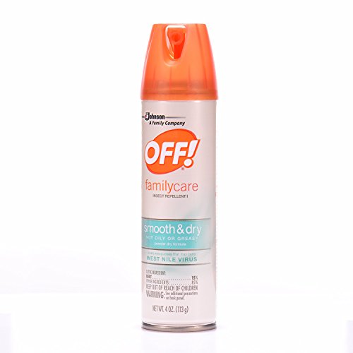 -. Binding : Health and Beauty -. Brand : OFF! -. EAN : 0046500223983 -. Feature : Advanced powder-dry formula dries on contact-not oily or greasy. / Repels mosquitoes that may carry the West Nile Virus, biting flies, gnats, ticks and no-see-ums. / Aerosol spray allows for even coating. / Formulated with 15% DEET-provides up to 6 hours of protection against mosquitoes. -. IsAdultProduct : 0 -. Label : SC JOHNSON -. LegalDisclaimer : Must be at least 18 & over to purchase -. Manufacturer : SC JOHNSON -. NumberOfItems : 1 -. PackageQuantity : 1 -. ProductGroup : Health and Beauty -. ProductTypeName : HEALTH_PERSONAL_CARE -. PublicationDate : 2016-03-30 -. Publisher : SC JOHNSON -. ReleaseDate : 2016-03-27 -. Studio : SC JOHNSON -. Title : Off! Family Care Smooth and Dry Insect Repellent, 4.0 Ounce -. UPC : 046500223983