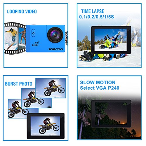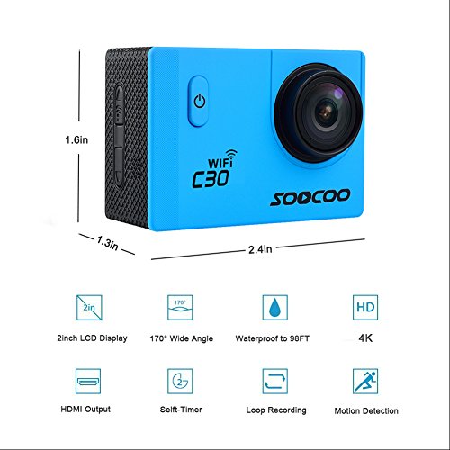 Sports Camera, SOOCOO C30 4K Action Camera 20MP 2.0 Inch Waterproof Diving Camera with 2x1350mAh Batteries and 18 Accessories Kit Included - Blue + Wifi (Micro SD Card Not Included)