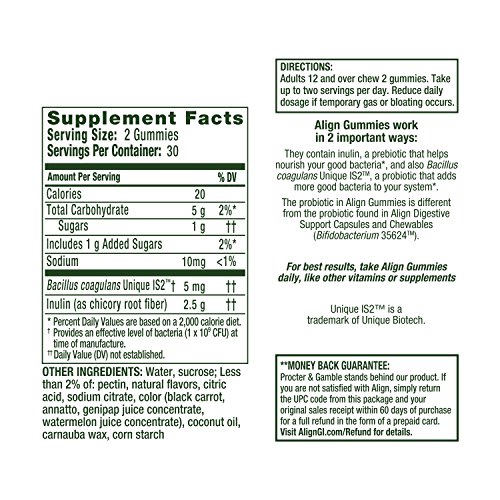 "Align Prebiotic + Probiotic Gummies are made of a blend of prebiotics to nourish the good bacteria in your digestive system, plus probiotics to add more good bacteria. All in great-tasting gummies made with natural fruit flavors. THESE STATEMENTS HAVE NOT BEEN EVALUATED BY THE FOOD AND DRUG ADMINISTRATION. THIS PRODUCT IS NOT INTENDED TO DIAGNOSE, TREAT, CURE, OR PREVENT ANY DISEASE."Feature