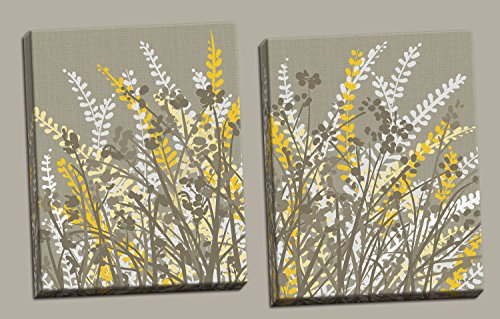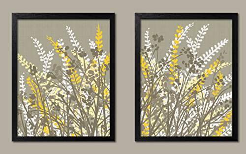 2 Gray, White and Yellow Floral Meadow Print Set; Two 11x14in Poster Prints
