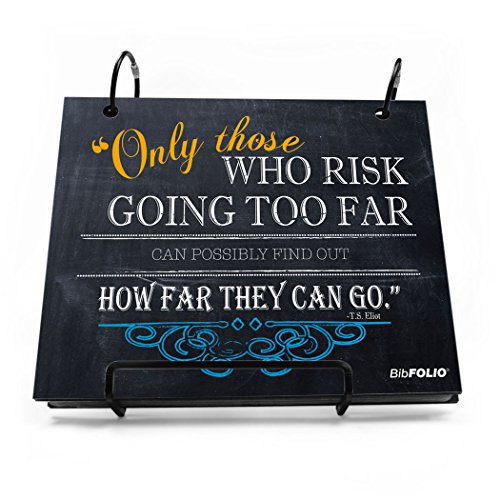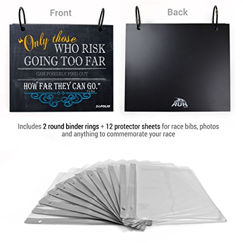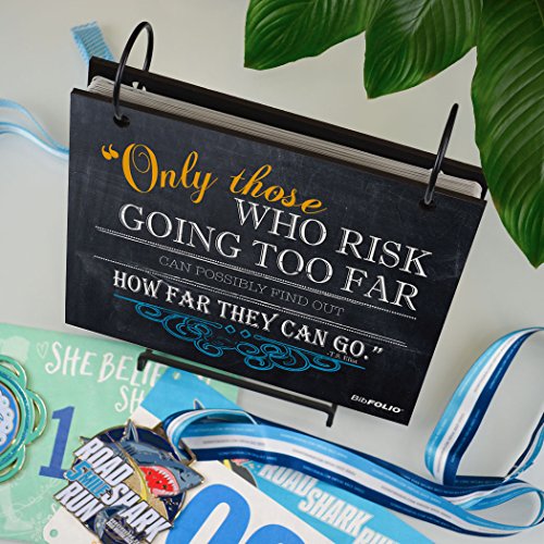 THE ORIGINAL BIBFOLIO® RACE BIB ALBUM protects and beautifully displays your impressive collection of race bibs from marathons, half-marathons, 5Ks, triathlons, road races, and other athletic events. This popular Only Those Who Risk Going Too Far Chalkboard BibFOLIO makes the perfect gift for a runner to keep on display at home or in the office!