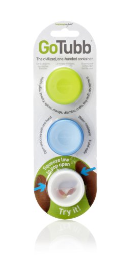 Humangear GoTubb is the civilized, one-handed container. Patented worldwide, the GoTubb features an ingenious design that allows you to open and close it with one hand only. Just squeeze the sides and the lid is released. To close, simply press back on. For everything that you can't squeeze out of a GoToob, there's GoTubb. The GoTubbs work great with pills, knick-knacks, snacks, vitamins, change, bits-n-pieces, you name it. A recessed, textured labeling area resists being rubbed off. And the transparent tops let you see what's inside without opening them.
