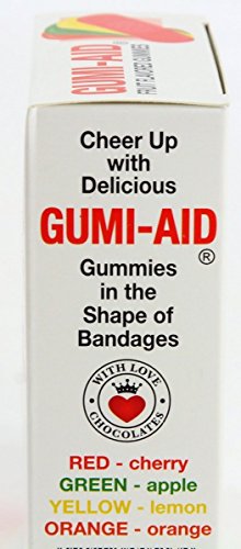 -. Feature : 2 packs of 3 oz boxes. 9 bandages in each 3-ounce box. / GUMI-AID comes in four fun flavors: Cherry, Apple, Lemon, and Orange. / Created in the 1980s by the Lemberger Candy Company, CHOC-AID and GUMI-AID have been helping people of all ages cheer up ever since. / Perfect for party favors, get well gift baskets, medical themed parties / Made in USA. Kosher.