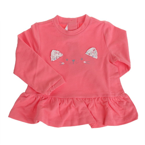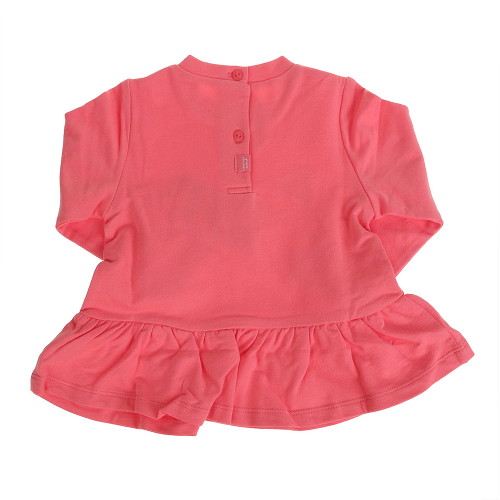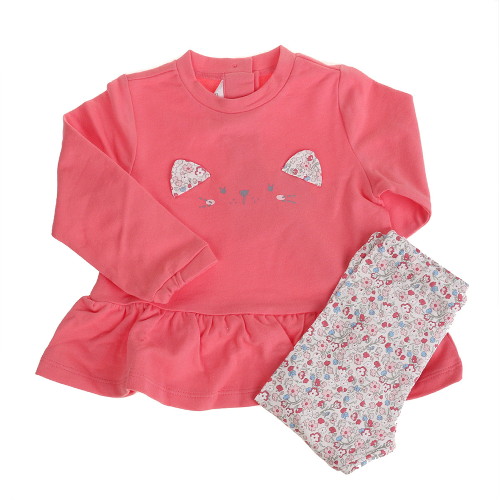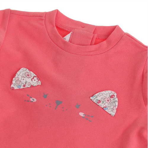 - 티셔츠 밑단의 프릴장식과, 바지의 꽃나염 처리가 되어 더욱 여성스러운 느낌으로 입히실 수 있습니다.