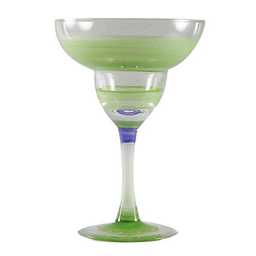 Studio : Crafted Creations Publisher : Crafted Creations Product Description The Green Retro Stripe Collection features green stripes throughout the glass, along with a white and purple stripe on the stem The stripe design is hand painted onto the bowl and the stem of the margarita glass Each glass holds 10.5 ounces Made in the USA Dimensions: 7" Materials: glass Set includes 2 of the item shown 0