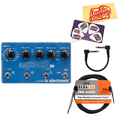 Studio : TC Electronic Publisher : TC Electronic Product Description Bundle includes Gearlux Instrument Cable, Patch Cable, Picks, and Polishing Cloth. Flashback Delay. The sounds, the vibe, TonePrints, the entire package - it was a smash hit that rocked the world. But at TC, we're more about moving things forward and listening to the feedback from the guitar community. And so, when wishes for things like presets and tap-tempo started rolling in, we listened. And boy, did we knock it out of the park. Think of your favorite delay sounds and chances are it's a TC sound. Our delays are the industry standard, and our 2290 Dynamic Digital Delay is one of the most coveted pieces of gear out there today. We know and love delay, and have made sure Flashback X4 delivers the legendary TC quality at every turn. From the awesome digital 2290 sounds to beautiful analog tape echoes and more exotic vibes of a reverse delay, Flashback X4 delivers every delay sound under the sun - past, present and future. Flashback X4 is so much more than the sum of four Flashback pedals. Sure, we do what we do to pay the bills, but at the core, we do this for the love of guitar. Our guitar team is dedicated to contributing to the guitar community because we are part of it! So, when feedback from Flashback Delay users started pouring in, we listened. So many guitarists out there wanted presets, and the ability to switch between delay sounds instantly. Using Flashback's amazing sounds but switching between flavors made tons of sense to us, and so Flashback X4 caters to that wish perfectly with three presets that can be as different and varied as you need them to be. The tap tempo feature was a no-brainer as that is already a fan favorite with some of our other delay pedals. You can easily set delay times or sync up with for example a drummer. Match delays to your guitar rhythms or solo ideas and diversify your playing with different tempos. 0