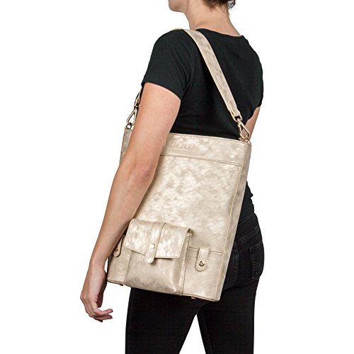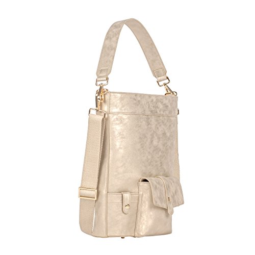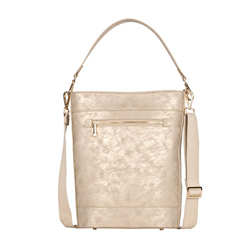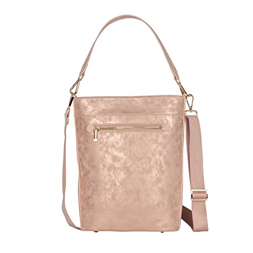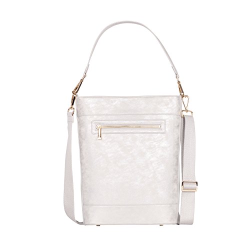 Product Description Chic streamline carryall made from metallic surface faux leather . This super versatile structured bucket bag can be carried on your arm, shoulder or crossbody with the adjustable web strap. Luxury high-end gold plated hardware will last longer, scratch resistant and keep its shine. Blind emboss logo provides understated branding. 0