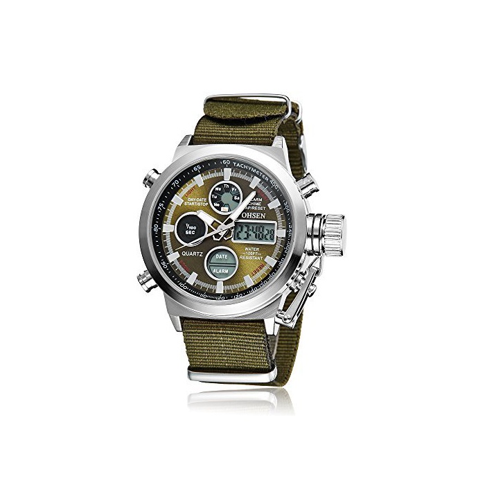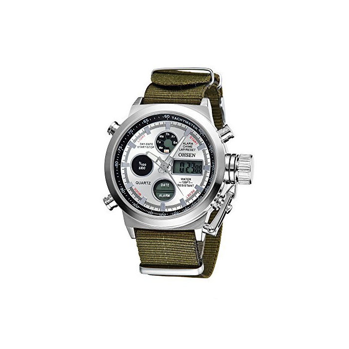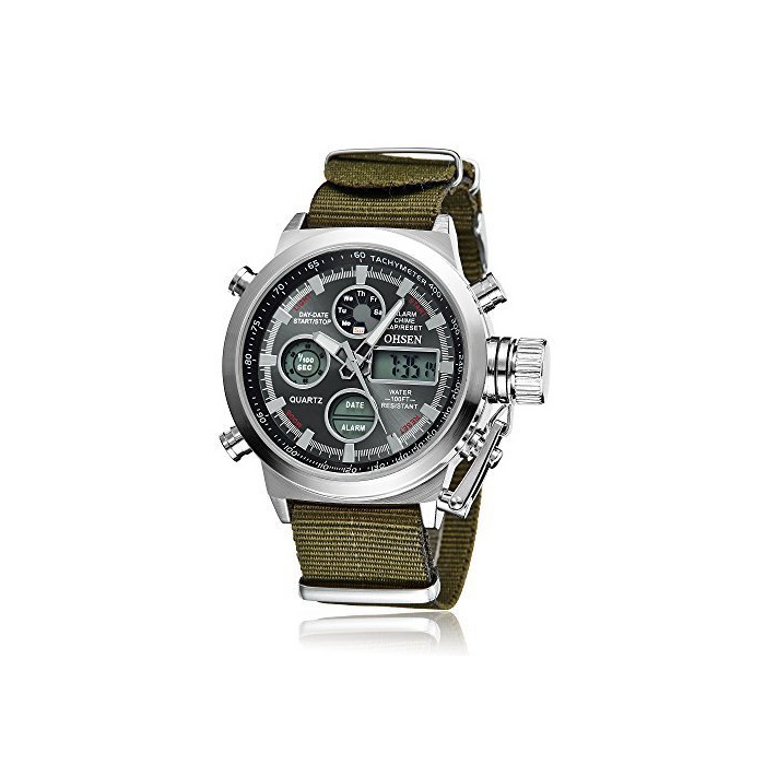 OHSEN 손목시계 맨즈 LED 아나운서 디지털 스포츠 알람 날짜 요일 크로노그래프 다기능 워치-군대 그린