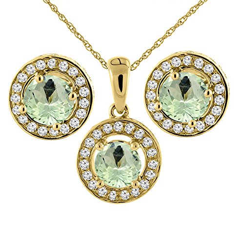 -. Title : 14K Yellow Gold Natural Green Amethyst Earrings and Pendant Set with Diamond Halo Round 5 mm