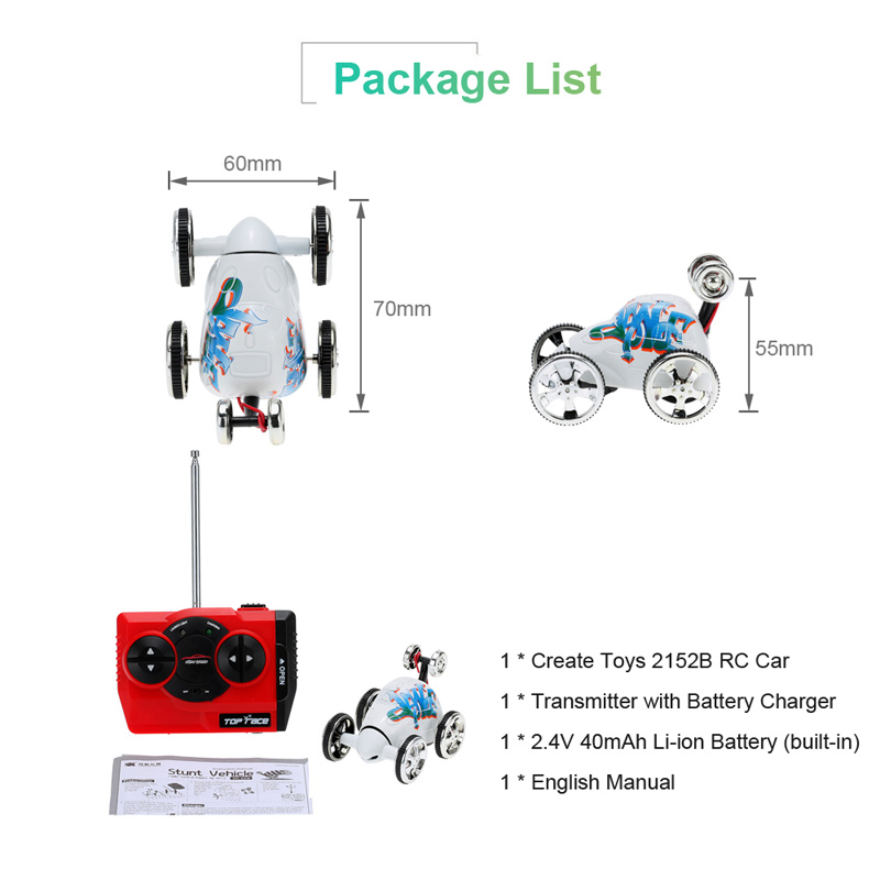 If you love remote controlled toys, you will love the super mini remote controlled stunt car. The remote control model car is ideal for your children. The car is 2CH RC control goes backward and forward, steers left and right, 360 degrees roll.
