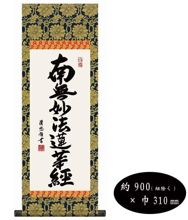 清らかな書に深い仏徳がこめられた有難い御名号。仏事だけでなく日常掛としてもお使いいただける逸品です。 製造国:日本 素材・材質:準金襴佛表装 本紙:新絹本軸先:樹脂 商品サイズ:約900(紐除く)×巾310mm 仕様:化粧箱入 付属品:表装品質保証書(保証期間10年) ※サプライヤー直送品 ご注文後7~8営業日後の出荷となります【商品名】吉田清悠 仏書掛軸(中) 「日蓮名号」 H6-046