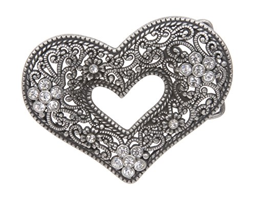 Product Description-Perforated -Heart and rhinestone -Cut out flower with rhinestone detailing -Material: metal -Dimension: 4" X 3" -Fits belt of width: 1 1/2"0
