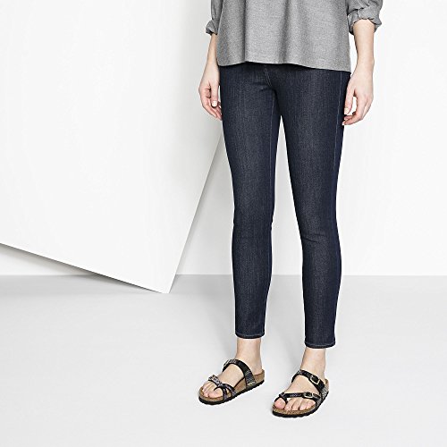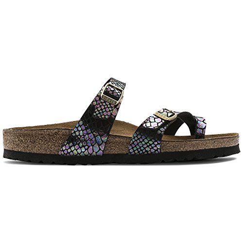 Binding : Apparel Product Description The BIRKENSTOCK Mayari thong sandal sets itself apart thanks to its svelte design. Calling all health-conscious fashionistas: this classic model with its fine and slender straps is now available in an elegant and tantalizingly shimmering "shiny snake" edition. BIRKENSTOCK has used the Birko-Flor® material, which is exceptionally durable yet gentle on the skin, and added an iridescent metallic coating in an uncannily natural snakeskin look. The underside of this high-quality synthetic material is lined with an exceptionally soft and smooth layer of fleece. The shimmering reptile look is sure to turn heads. The alternation between small and large scales gives the material a life-like look. Each individual shoe is unique. The anatomically formed original BIRKENSTOCK cork-latex footbed with its velvety soft suede lining makes the Arizona a light companion for both indoor and outdoor wear. The ultra lightweight, flexible EVA promotes a natural rolling motion that cushions the joints. Birko-Flor is made of easy-to-care-for and hygienic PVC, which has been lined on the inside with a soft, breathable layer of fleece. This high-quality material is very gentle on the skin, and it's comfortable while also being very durable. The flexible leather lining, which is gentle on the skin, nestles up softly against your foot and adjusts to its contour. The open-pored and thus very breathable surface makes for a comfortable foot climate, even during more strenuous physical activity. Cork is a sustainable material extracted from the bark layer of the cork oak. This natural product is insulating and offers very good cushioning. EVA (ethylene vinyl acetate) is a high-quality, very light, elastic material with extremely good cushioning. As a result, it smooths out slight irregularities in the floor and ensures that every step is softly cushioned.. 0