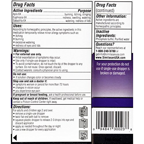 -. Binding : Health and Beauty -. Brand : Similasan -. EAN : 5056018928114 -. Feature : Relieves Itching, Burning and Watering Associated with Allergies / Homeopathic - Preservative Free - Original Swiss Formula / 100% Natural Active Ingredients / Give your eyes soothing relief from irritating allergens such as pet dander, mold spores / Have no known side effects or drug interactions -. IsAdultProduct : 0 -. Label : Similasan -. Manufacturer : Similasan -. MPN : KE946822 -. PackageQuantity : 1 -. PartNumber : KE946822 -. ProductGroup : Health and Beauty -. ProductTypeName : HEALTH_PERSONAL_CARE -. Publisher : Similasan -. Studio : Similasan -. Title : Similasan Allergy Eye Relief - 0.015 fl oz - Relieves Itching, Burning and Watering Associated with Allergies - Homeopathic