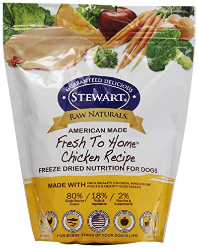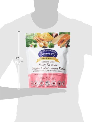 Dogs were designed by nature to hunt and thrive on a diet rich in animal protein, not fillers and grains. Inspired by nature, Stewart Raw Naturals Chicken and Wild Salmon Recipe recipe is a poultry based dog food with real Chicken being the number one ingredient and is grain and gluten free. We didn't stop there. We packed it with superfoods for optimal canine health creating one of the most nutritous dog foods on the market. Our Fresh To Home™ natural dog food is produced with human grade ingredients source in USA. The benefit of raw diets is evident whether feeding alone as a complete and balanced diet, or as a food topper. High in protein and low carb to promote a lean, healthy body. The addition of antioxidant rich fruits and vegetables provide natural fiber and help support the immune and cardiovasular systems, while the balance of Omega 3 and Omega 6 fatty acids from wild salmon and salmon oi promote healthy skin and a shiny coat. Stewart Raw Naturals is formulated as a dog food for all life stages and comes in 7 varieties that are ideal for rotation diets or those with dog food sensitivities.Feature