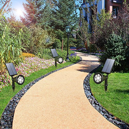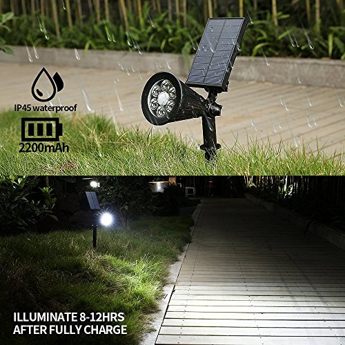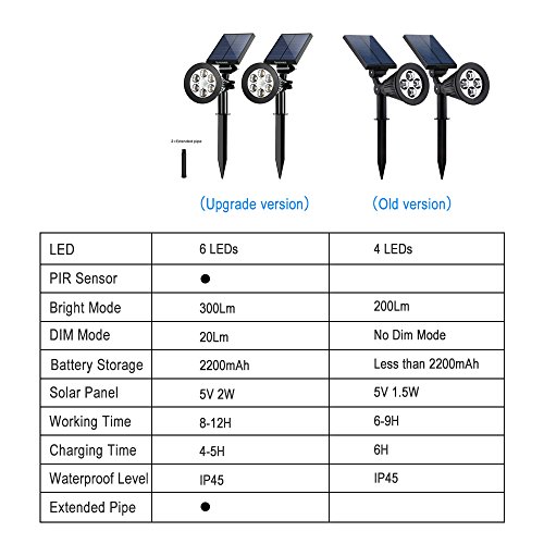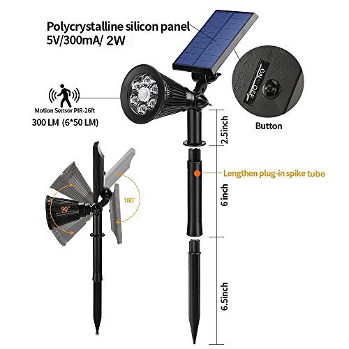 UPGRATED SOLAR OUTDOOR SPOTLIGHTS: Lastest generation solar powered landscape light with PIR motion sensor,which can stay on DIM mode when nobody near by, and change into bright mode immediately while it detects human or animal and stay lighting 60s. Saving energy and extend lighting time.