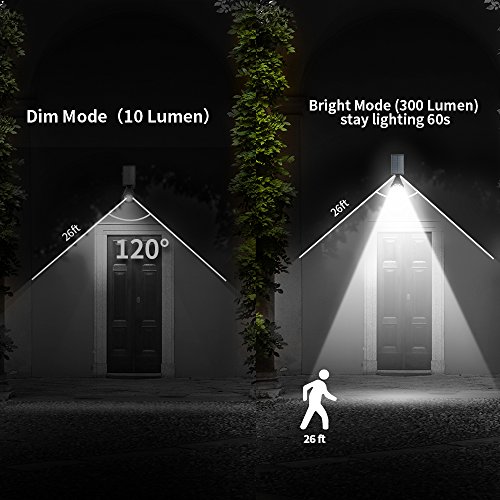 Solar Powered Motion Sensor Security Spotlights Outdoor: 2 modes - high light mode(300 LM) & dim light mode(10 LM)
