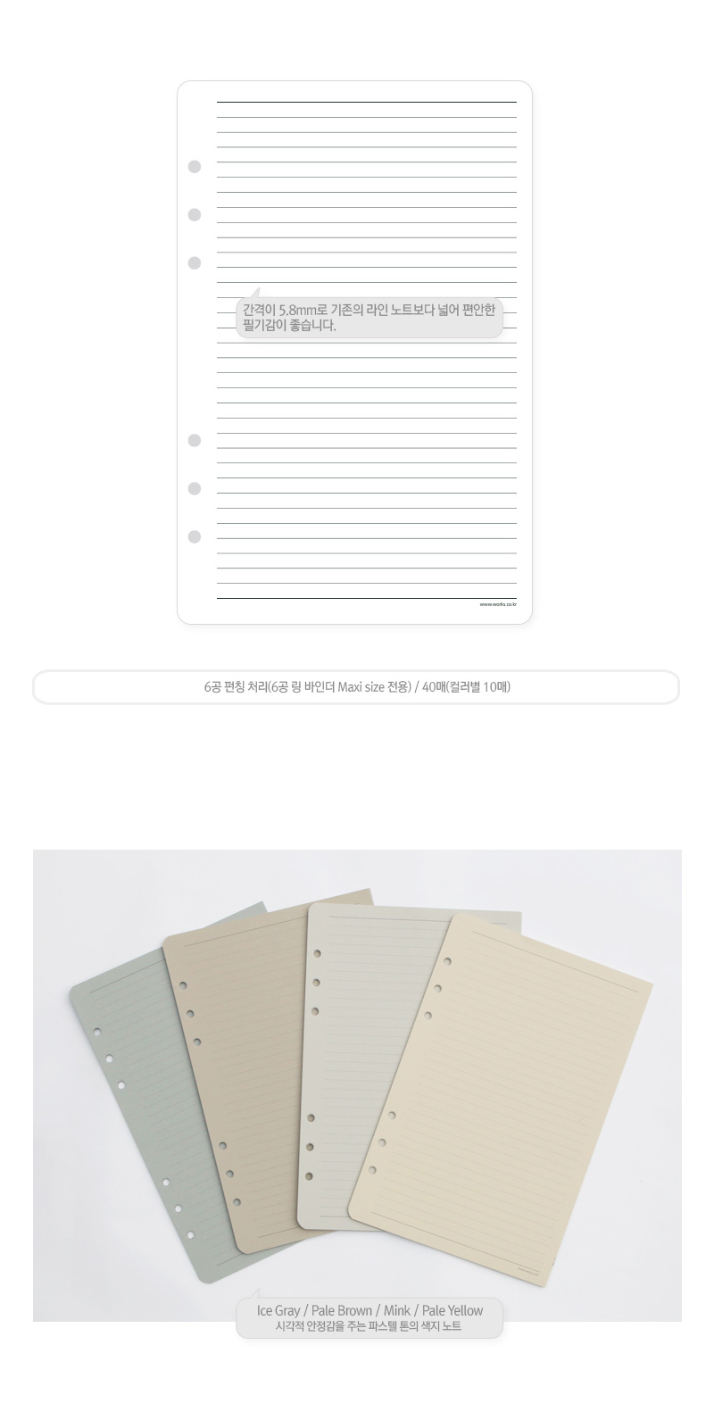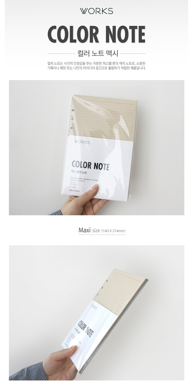 컬러 노트는 시각적 안정감을 주는 차분한 파스텔 톤의 색지노트로, Pale Yellow, Pale Brown, Mink, Ice Gray 등 4가지 컬러의 노트가 각 10매씩 총 40매로 구성된 솔루션 제품입니다.