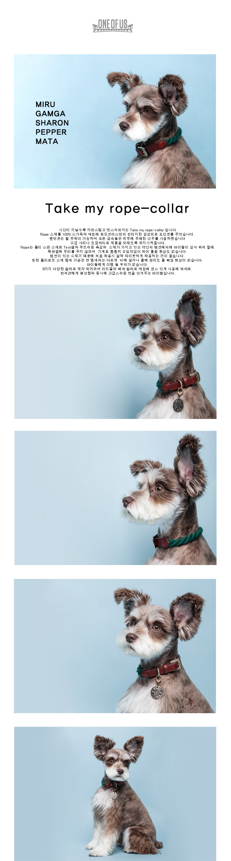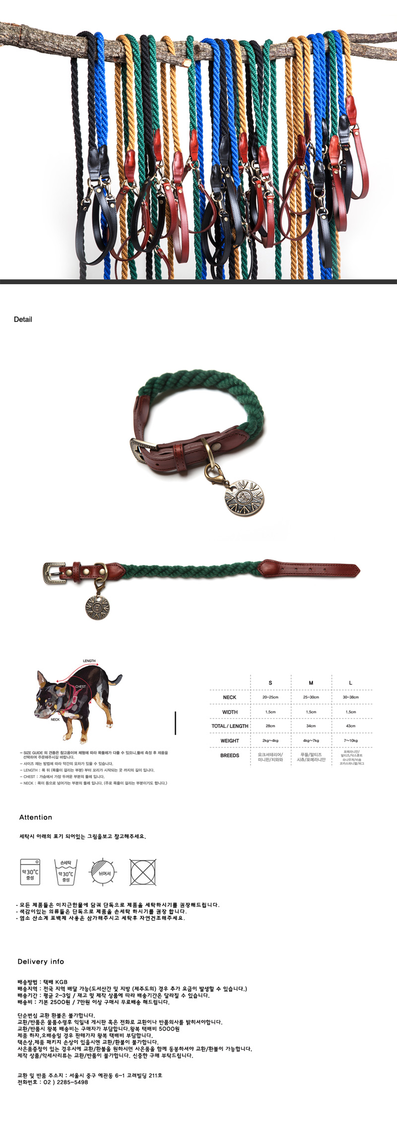 | 시간이 지날수록 자연스럽고 멋스러워지는 Take my rope-collar 입니다. Rope 소재를 100% 소가죽과 매칭해 원오브어스만의 빈티지한 감성으로 포인트를 주었습니다. 펜던트는 탈 부착이 가능하며 모든 금속들은 피부에 무해한 신주를 사용하였습니다 고급 사티나 도금처리로 제품을 오래도록 유지시켜줍니다. Rope는 폴리 스판 소재로 Test결과 부드러운 촉감과 소재가 가지고 있는 약간의 텐션에의해 아이들이 앞서 뛰려 할때 목관절에 무리를 주지 않으며 기계로 촘촘히 꼬임작업이 되어 풀림 현상도 없습니다. 텐션이 있는 소재기 때문에 처음 착용시 살짝 타이트하게 착용하는 것이 좋습니다. 또한 폴리로프 소재 염색 가공은 면 염색과는 다르게 비에 닿거나 물에 젖어도 물 빠짐 현상이 없습니다. 아이들에게 이염 될 우려가 없습니다. 5가지 다양한 칼라로 제작 되었으며 리드줄과 배색 칼라로 매칭해 센스 있게 사용해 보세요. 반려견에게 편안함과 동시에 고급스러운 멋을 안겨주는 아이템입니다.. |