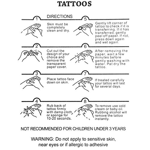 3. How to stick and remove? 1). Clean and dry the skin completely 2). Cut out the design of your choice 3). Remove the transparent film, and press"TATTOO" face down on the skin 4). Make the "TATTOO" wet completely via water 5). Peel the corner of the "TATTOO" gently to check if it is transferred. 6). Your "TATTOO" can last for several days if transferred carefully