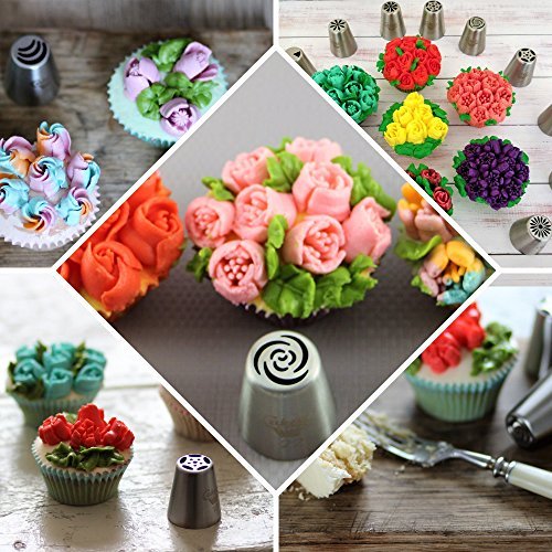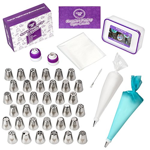 CAKEBE RUSSIAN PIPING TIPS - 64 PCS - SUPPLIES FOR CAKE DECORATING PROFESSIONALS & FANS - ULTIMATE CAKE DECORATING SET - 36 ICING NOZZLES + GIFT BOX+ 20 PASTRY BAGS + SILICONE BAG + EBOOK MANUAL