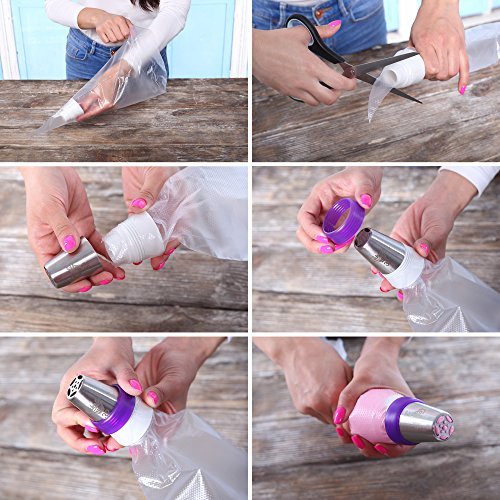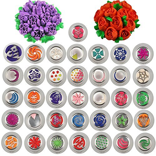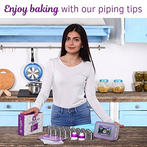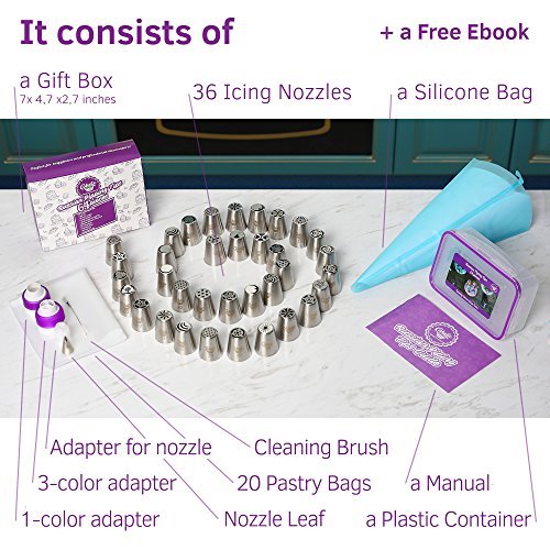 THE ULTIMATE SET. Our cake decorating kit is the ultimate tool to show off your creativity and imagination. It consists of 36 icing nozzles, 20 pastry bags, a silicone bag, a plastic container and a gift box. A free Ebook is also included with our cake decorating tools.